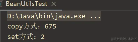 下面是使用BeanUtils.copyProperties拷贝数据和直接set的方式赋值效率对比,为了便于直观的看出效果,这里以拷贝1万次为例: