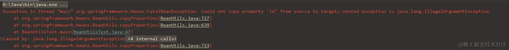 在测试案例中,id字段在拷贝源和拷贝目标中分别使用包装类型和基本类型,可以看到下面在拷贝时出现了异常。