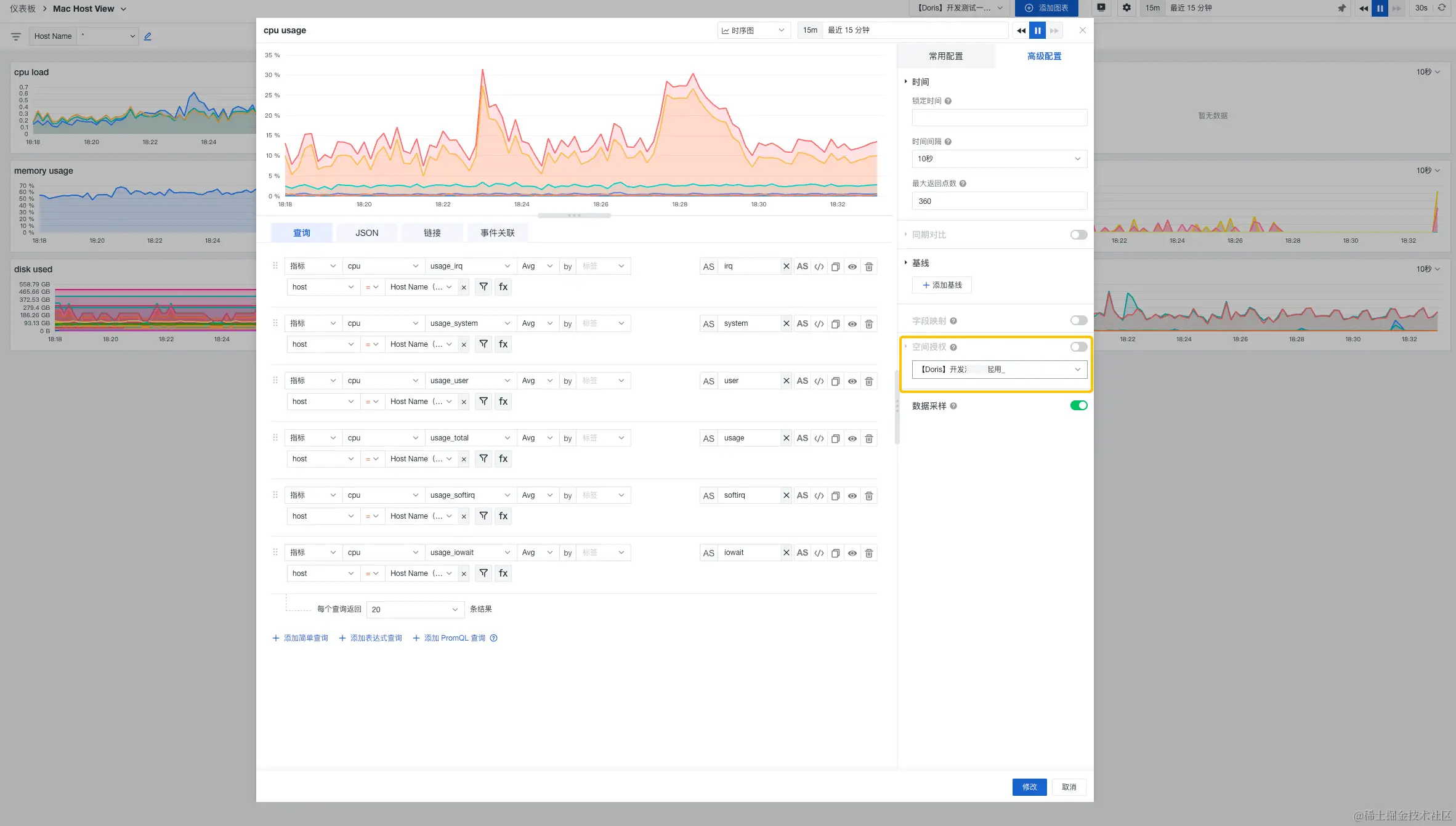 当查看 cpu 内存情况时,切换成 Doris 工作空间,我们就可以在相同查询条件下直接查看分析 Doris 工作空间的相关数据,大大提升了工作效率。