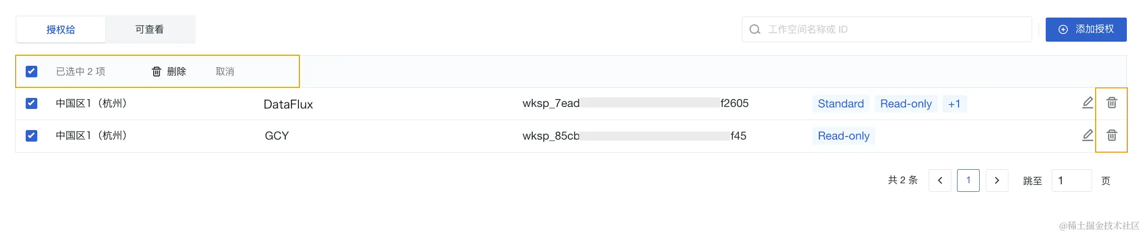 添加成功后,您就可以在授权列表查看和管理已经被授权访问当前工作空间数据的其他工作空间(如图中:DataFlux)。