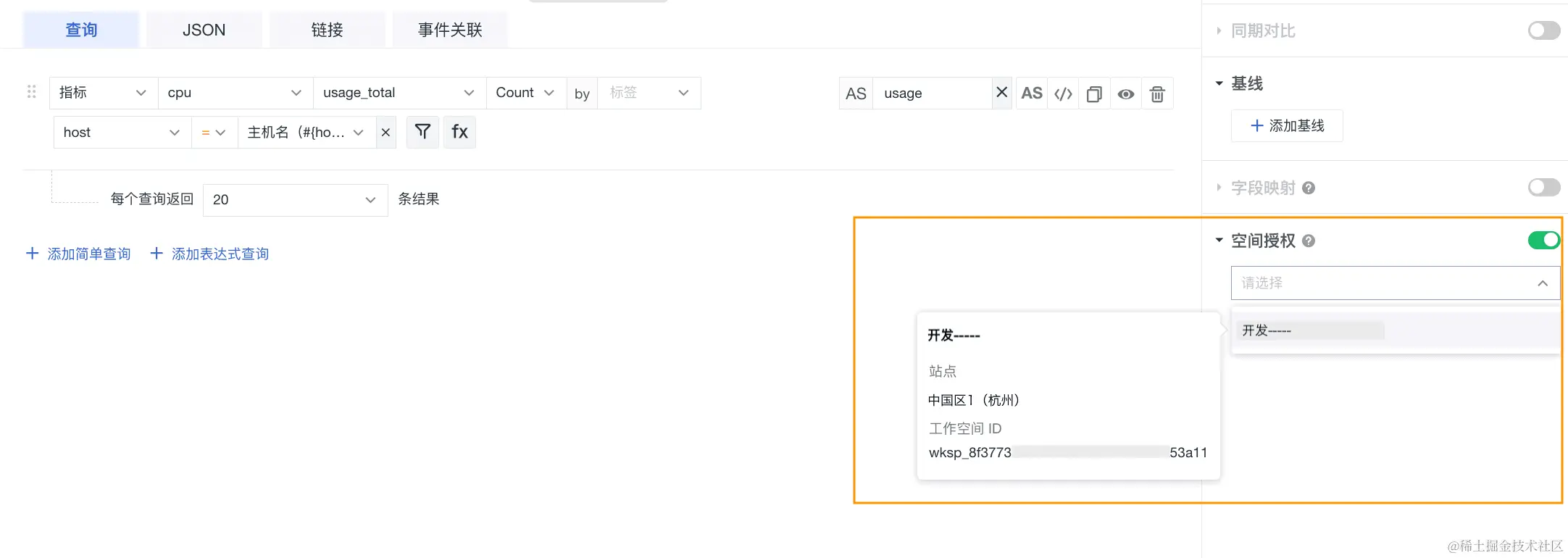 在场景 > 仪表板,选择图表组件,在高级设置 > 空间授权选择已授权的工作空间,然后就可以通过图表查询查看和分析该工作空间的数据。