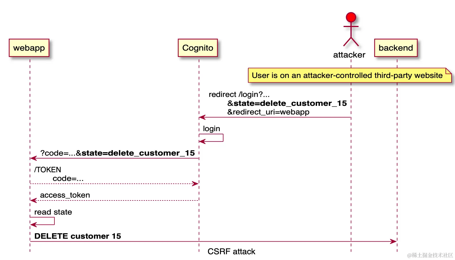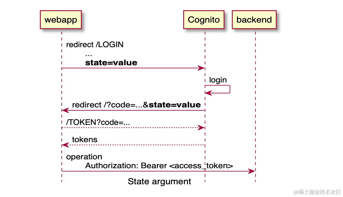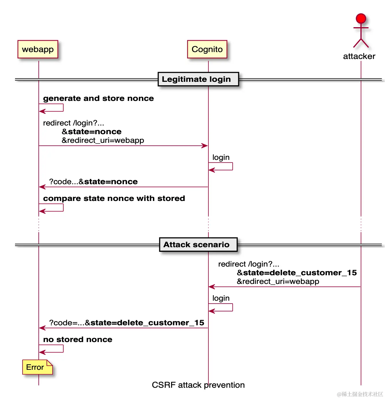 为了实现对 CSRF 攻击的防御,WebApp 需要生成并存储一个 nonce(随机生成的值仅使用一次)并将其用作状态。 然后,当 Cognito 重定向回 WebApp 时,WebApp 需要对比存储的状态值和接收到的状态值,如果不匹配则抛出错误。