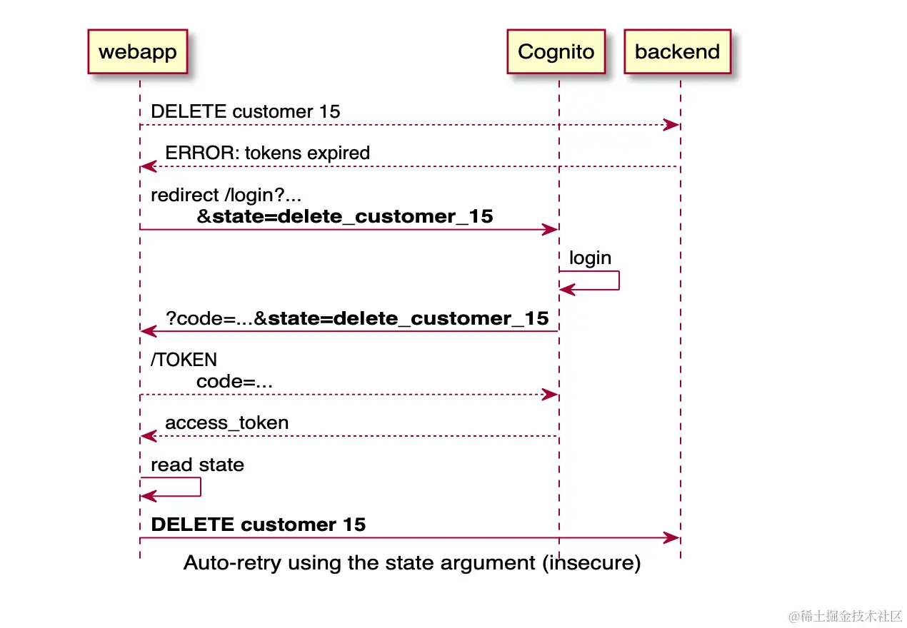 想象一下,一个 CRM 应用程序处理客户帐户,它的实现方式是在访问令牌过期时自动重试失败的操作。 例如,管理员可能想要删除客户帐户,但后端返回一个错误,指出浏览器需要重新登录。 webapp 重定向到 Cognito登录页面,然后 webapp 获取新令牌,然后使用新令牌重试操作。 实现这一点的最简单方法是将失败的操作添加到状态参数(state)中,以便 webapp 可以知道要重试什么样的操作。
