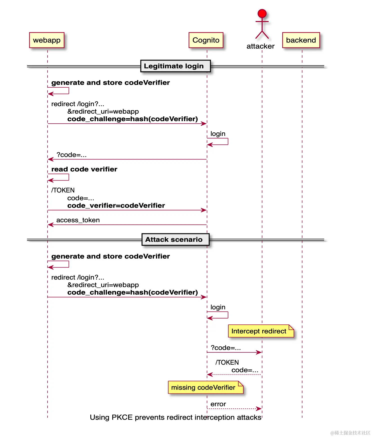 即使攻击者能够拦截重定向并获取到code参数,但没有webapp生成的code_verifier也是白搭。
