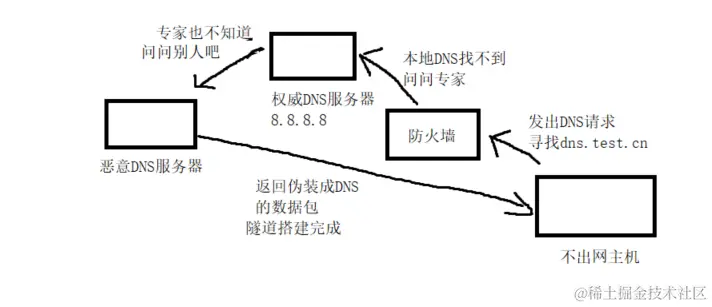 DNS隧道,是隧道技术中的一种。当我们的HTTP、HTTPS这样的上层协议、正反向端口转发都失败的时候,可以尝试使用DNS隧道。DNS隧道很难防范,因为平时的业务也好,使用也罢,难免会用到DNS协议进行解析,所以防火墙大多对DNS的流量是放行状态。这时候,如果我们在不出网机器构造一个恶意的域名(***.test.cn),本地的DNS服务器无法给出回答时,就会以迭代查询的方式通过互联网定位到所查询域的权威DNS服务器。最后,这条DNS请求会落到我们提前搭建好的恶意DNS服务器上,于是乎,我们的不出网主机就和恶意DNS服务器交流上了。