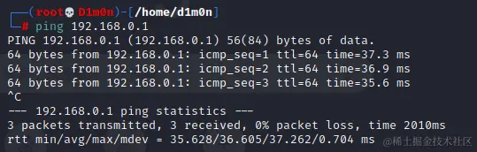 两条命令,DNS隧道就已经搭好了,可以ping一下我们的VPS(ip:192.168.0.1)看一下,是否能通: