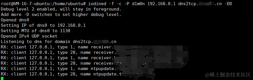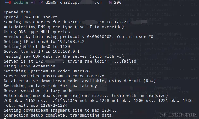 #-r:iodine有时会自动将`DNS`隧道切换为UDP隧道,该参数的作用是强制在任何情况下使用`DNS`隧道
