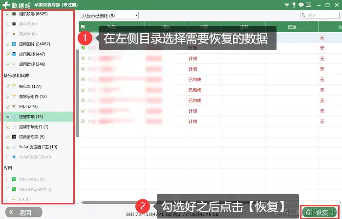 步骤3:扫描完成后,在左侧菜单栏中点击需要恢复的数据类型,比如短信、照片、视频、备忘录、聊天记录等等,跳转到相应数据的预览界面后,将数据进行勾选,最后点击**【恢复】**按钮即可。