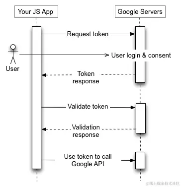 - Google 将用户重定向回您的应用。该重定向包含一个访问令牌,您的应用会验证该访问令牌,然后使用此令牌发出 API 请求。当令牌过期时,应用会重复该过程