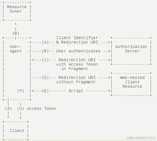 有些 Web 应用是纯前端应用,没有后端,必须将令牌储存在前端。RFC 6749 就规定了第二种方式,允许直接向前端颁发令牌,这种方式没有授权码这个中间步骤,所以称为(授权码)"隐藏式"(implicit)