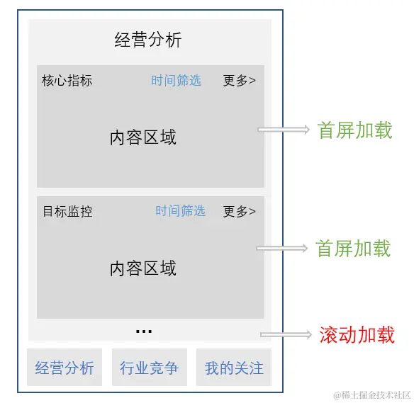 滚动加载是提升首屏渲染性能的很好方案,它的核心是判断目标元素(橱窗卡片)是否在可视区域范围内,当其不可见时,只需在卡片内容区渲染一个有默认高度的占位元素,同时也不必加载筛选区域组件,当用户滚动到该区域时,再渲染业务相关的内容。