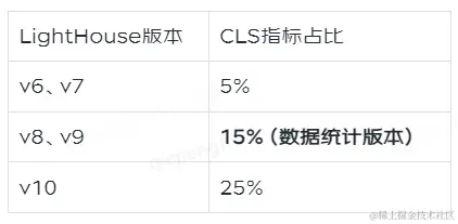 累积布局偏移(Cumulative Layout Shift),主要测量可见元素在可视区域内的移动情况。该指标需要重点关注,随着Lighthouse的版本迭代,该指标占比一直呈上升趋势,也是页面性能优化容易忽略的方面。以下为Lighthouse不同版本中CLS指标的占比情况: