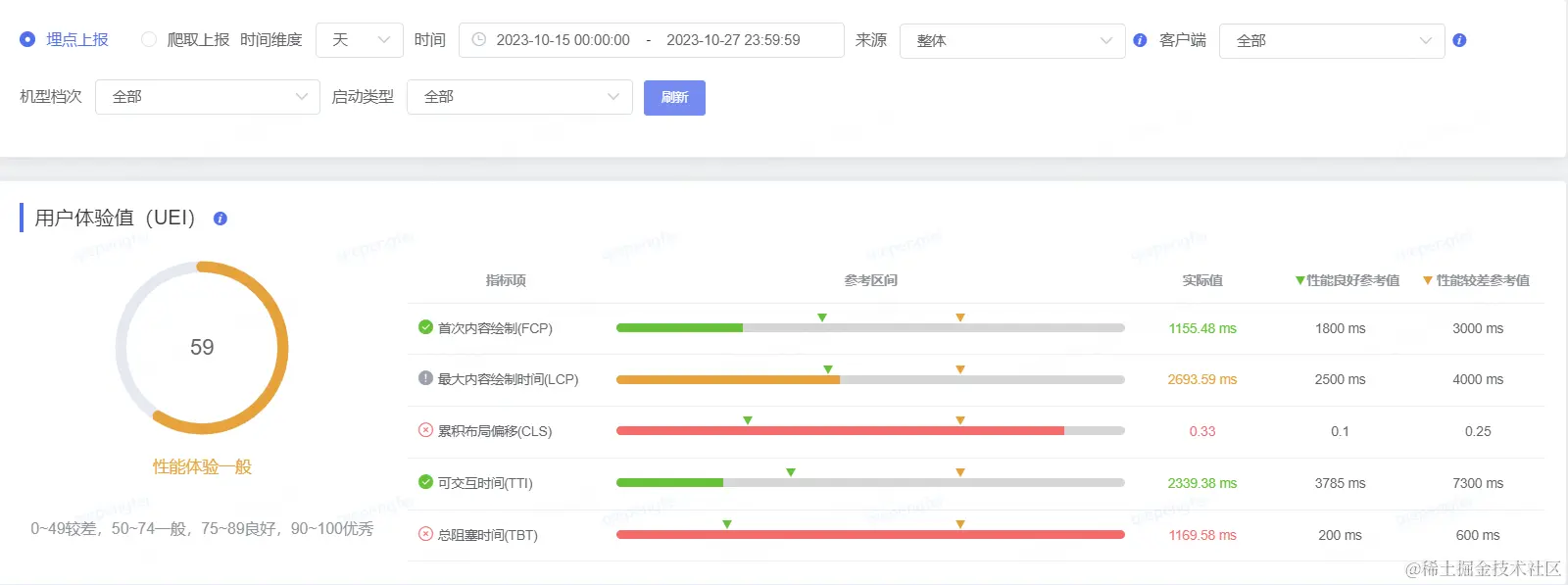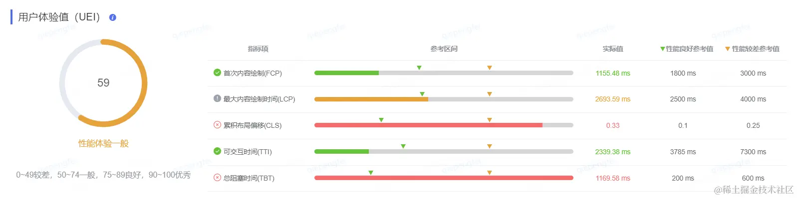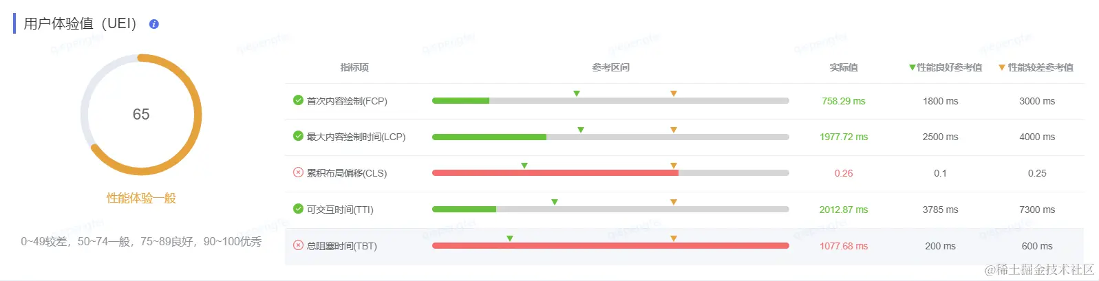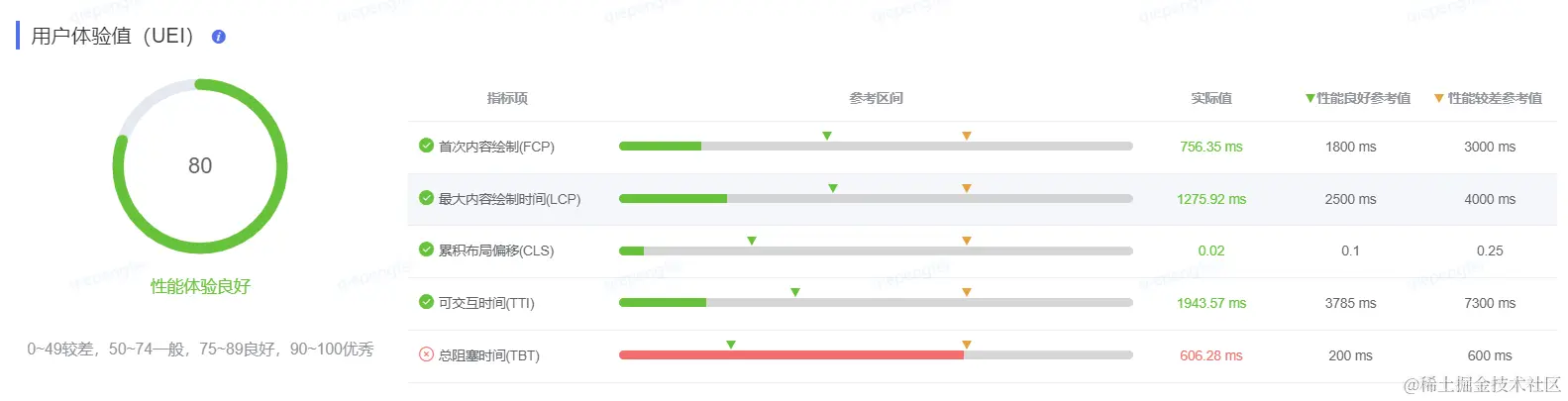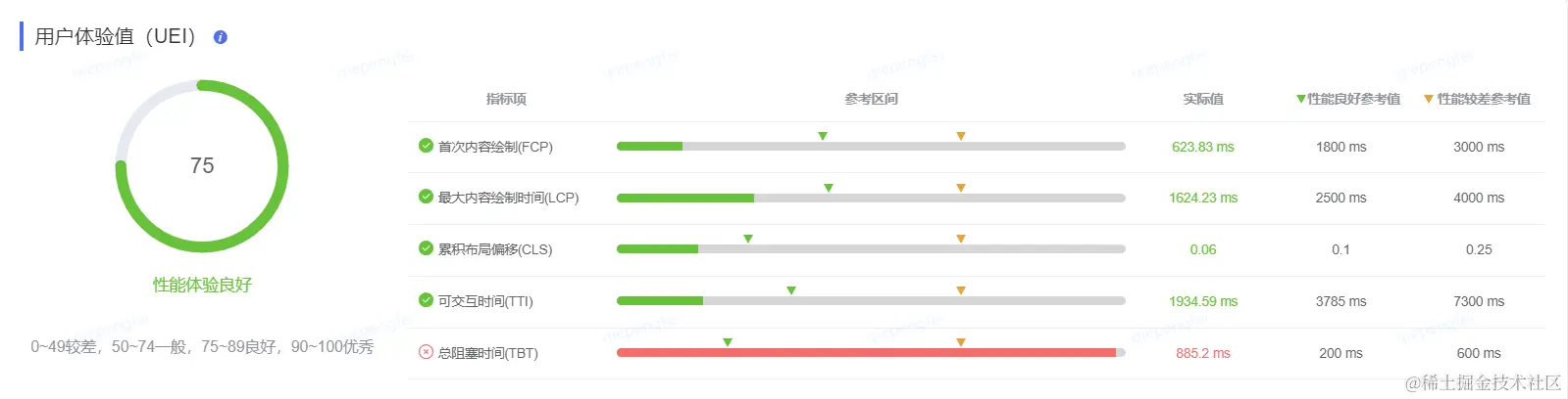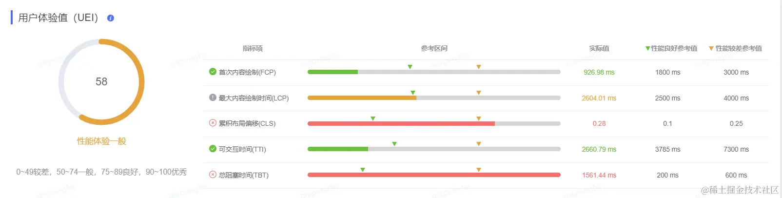 UEI指的是用户体验值,烛龙平台底层使用的是Lighthouse性能统计工具。其中,单页面的得分统计规则与其保持一致(性能指标分数的加权平均值)。针对多页面应用,整体评分计算规则为,每个页面得分的加权平均值:(页面A * A访问量 + 页面B * B访问量 ...)/ (A访问量 + B访问量 + ...)。