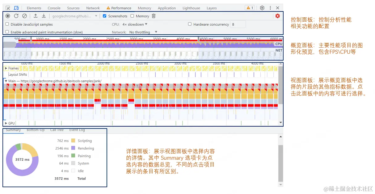 以上为performance面板的概览图,通过对页面加载过程的录制,查看视图面板的主线程工作过程,我们能够找到页面阻塞的长任务,从而优化TBT指标;交互阶段存在的动画卡顿等问题,也可以通过该面板进行分析和优化。