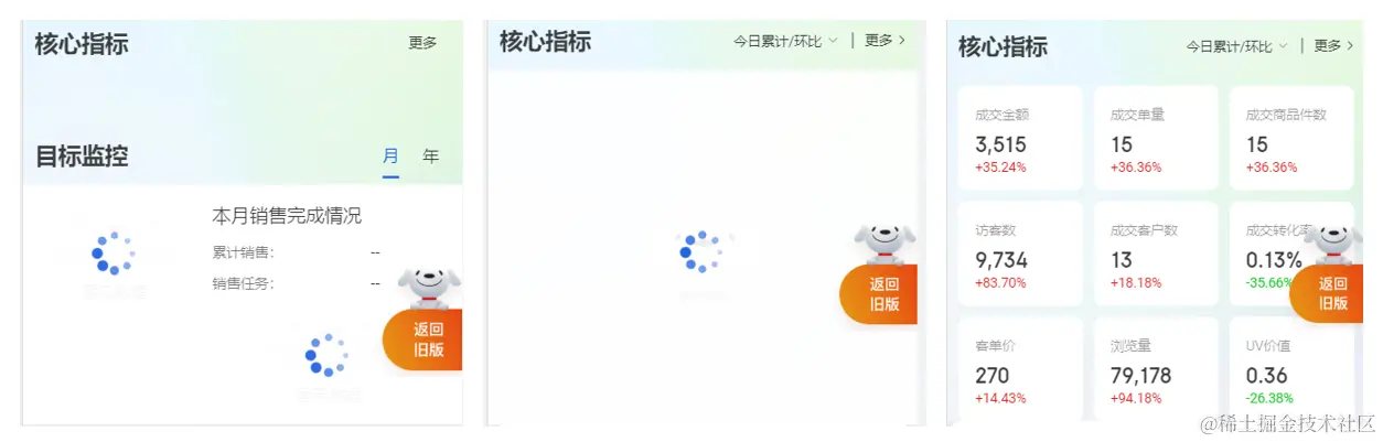 类似于核心指标卡片,在指标卡加载前,内容区域高度为0,而loading加载后,有一个200px的占位高度,真实的指标卡渲染出来后,高度变为322px,用户能够感觉到明显的抖动。