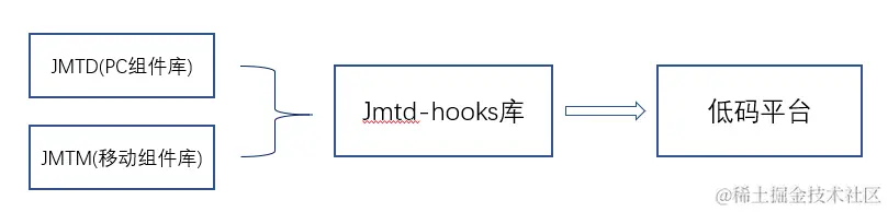 自研组件库主要包含三个包,PC组件库jmtd、移动组件库jmtm、jmtd-hooks库。其中hooks库是对两端组件库的二次封装,帮助低码平台处理组件间的逻辑编排功能,三个库均通过npm包的方式引入。
