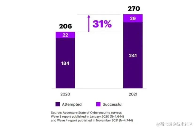 埃森哲报告显示,2021年企业面临的网络攻击比以往任何时候都多。每家公司遭受的网络攻击大幅增加了31%,从206起增加到270起。这些攻击包括未经授权访问信息、应用程序、基本服务、网络设备等。