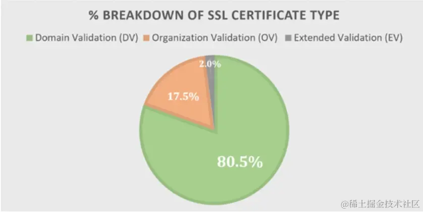根据101domain的报告,域名验证型DV SSL证书是最受欢迎的数字证书之一,在企业验证型OV SSL证书和扩展验证型EV SSL证书之间占有80.5%的市场份额。其他类型的SSL证书,OV SSL证书具有17.5%的市场份额,EV SSL证书占据的2%市场份额。