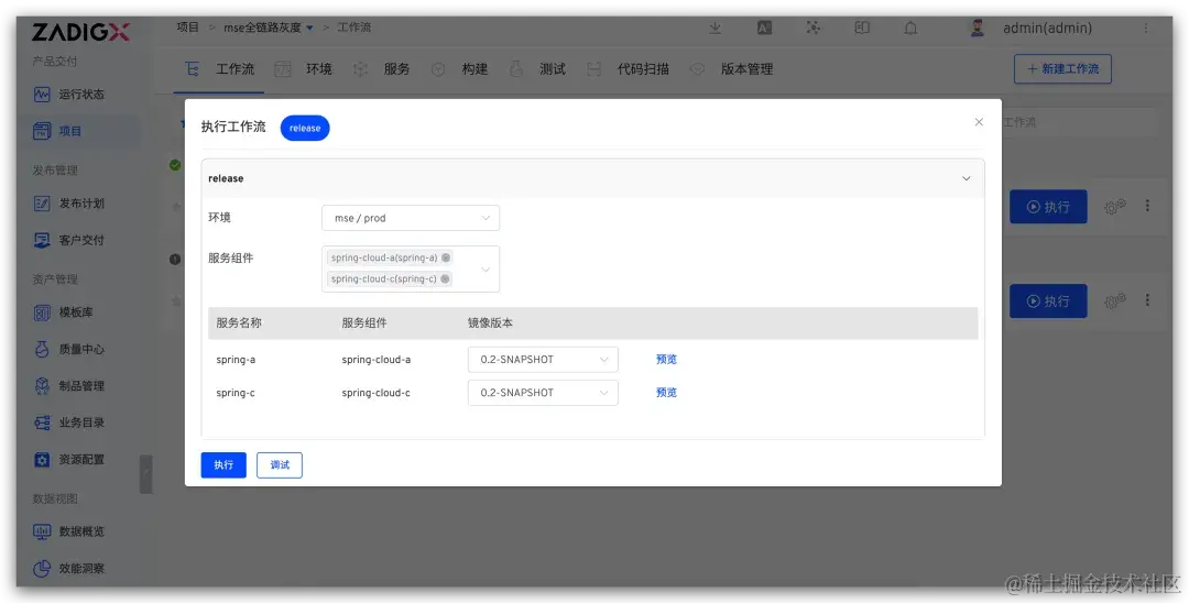 执行 mse-gray-workflow,选择服务组件 spring-cloud-a 和 spring-cloud-c ,设置灰度标,选择对应的灰度镜像、副本数量、修改灰度服务 YAML 配置,点击执行即可完成灰度服务部署。