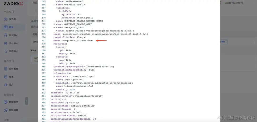 4. 检查服务是否成功接入 MSE。在 Zadig 环境中选择服务,比如 spring-a ,检查 Pod YAML 中是否成功注入 one-pilot-initcontainer ,如下图所示。