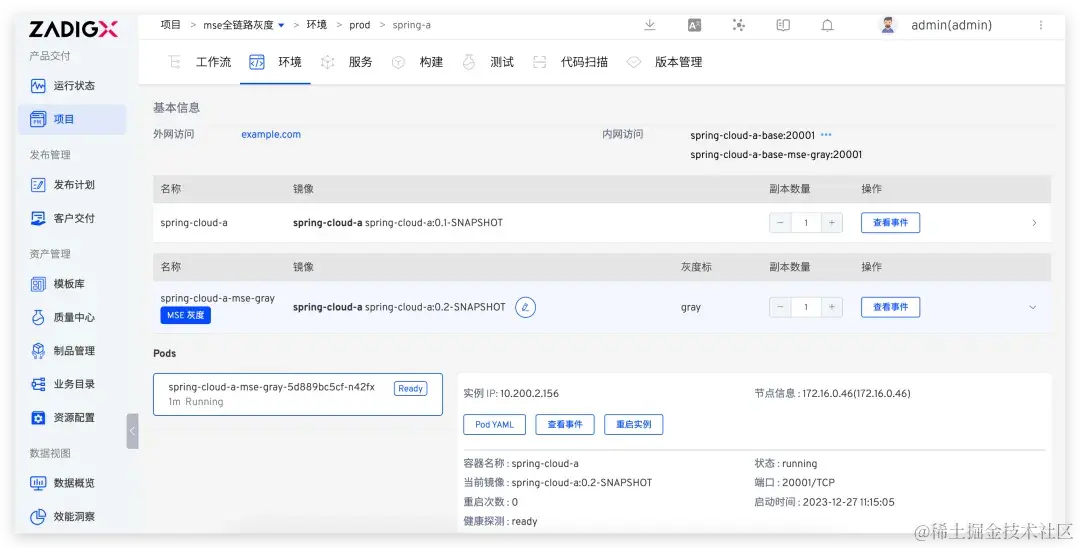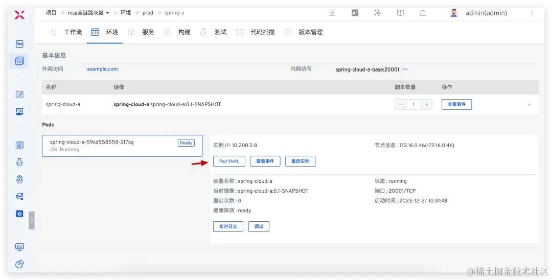 部署完成后,可在生产环境中查看灰度服务的运行状态和基本信息。