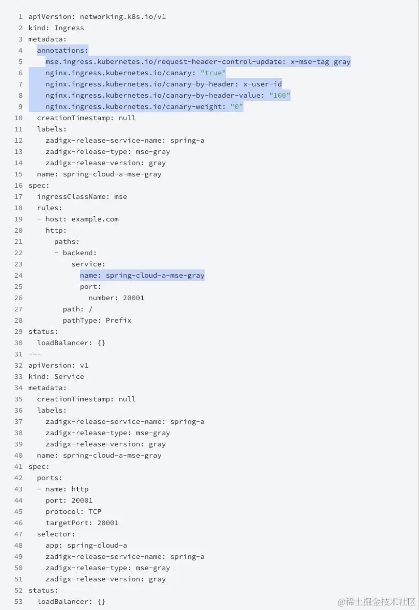 此处 spring-cloud-a 为流量入口,因此需要在灰度服务 YAML 中手动添加/修改 Service 和 MSE Ingress 资源的一些相关字段: