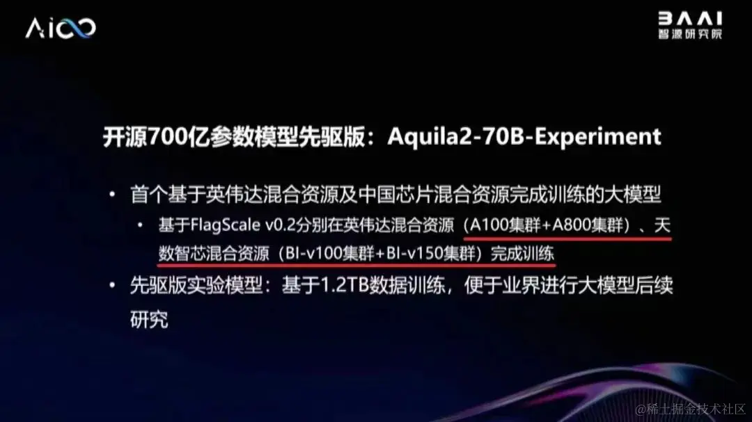再来看咱们的国产训练卡,这里主要提两款,一个是华为昇腾 Ascend 910b,一个是天数天垓100 BI-V100 (以及新一代天垓150)。先说天数的,前几天有个读者问我:国产训练卡有啥推荐的 (除了昇腾外),当时我刚看完 "2023 人工智能计算大会" 智源研究院林咏华老师分享,随之很自然的脱口而出:可以看看天数的。看下面两张图吧,我知道的是天垓 BI-V100 是对标 NVIDIA V100 的,至于 BI-V150 是什么级别,这个目前我还不太清楚。