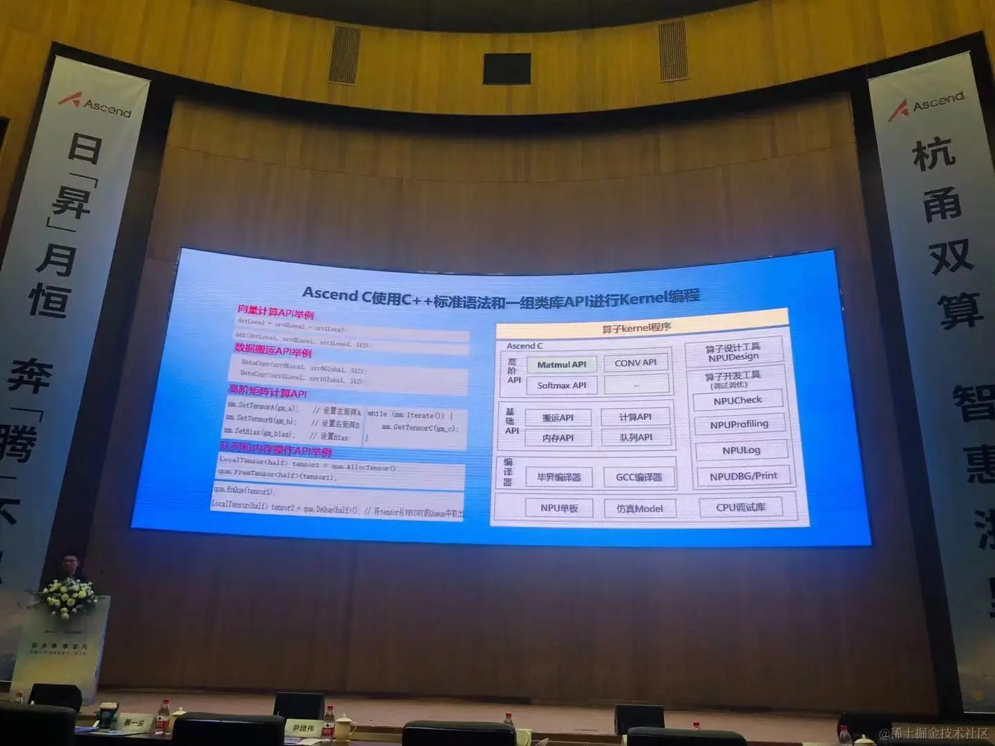 来说昇腾 Ascend 910b,对于昇腾 910b 处于什么样的水平,23 年科大讯飞三季度业绩说明会上已经给昇腾 910b 定了一个 "基调":"昇腾 910b 芯片的性能已经达到了英伟达 A100 芯片的水平,甚至在某些方面还有所超越"。所以现在很多提到昇腾 910b,都会拿 "可直接对标 A100" 来形容。虽然我没用过昇腾 910b,但是从它的算力性能数据来看,确实是挺强的。另外更加重要的是昇腾的 "基建能力" 特别强,超算中心已经有好几个,杭州范围内就有滨江超算中心和宁波超算中心,下面是前段时间参加昇腾开发者大会的图。"杭勇双算 智惠浙里,日昇月恒 奔腾不息",不得不说,华为是懂 "对联" 的。