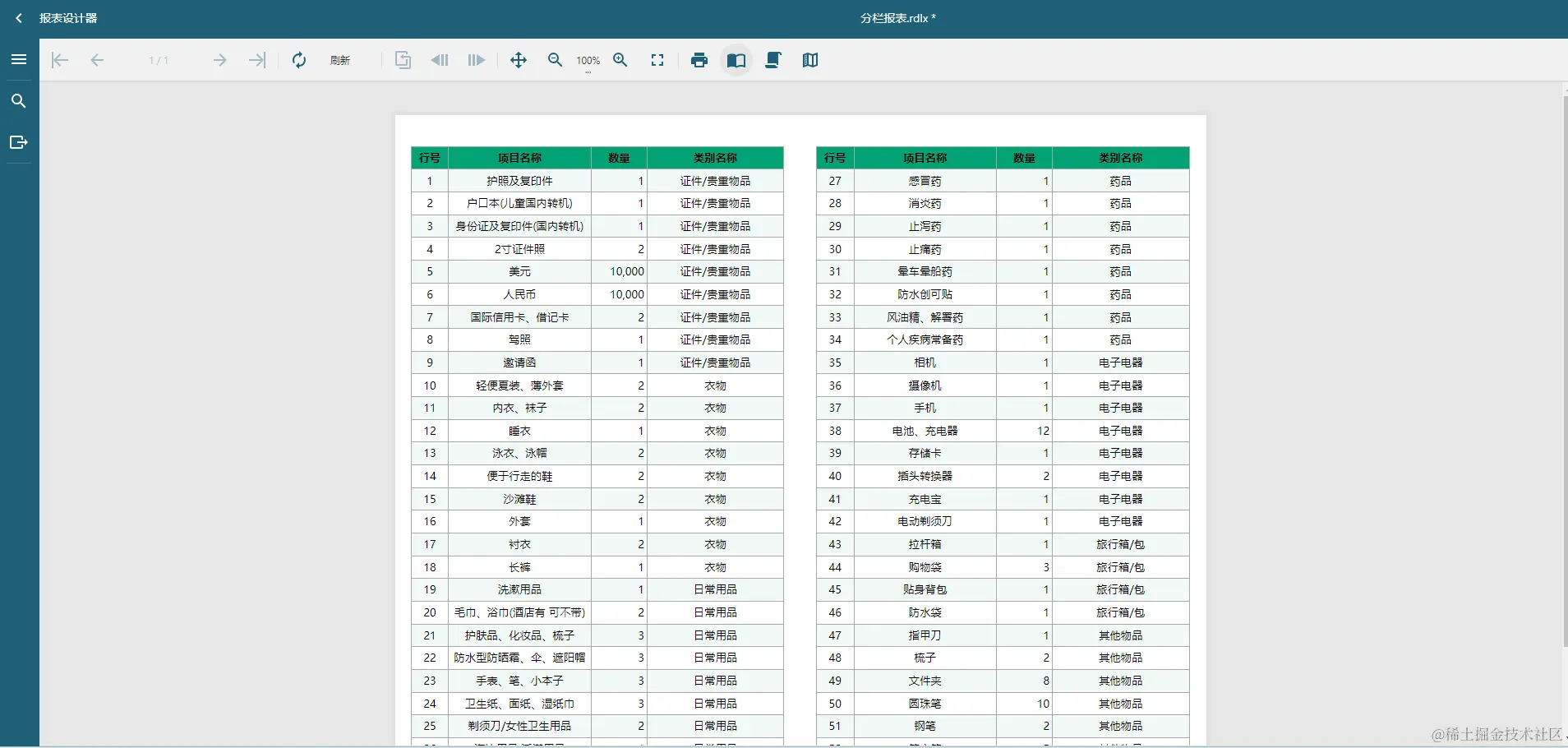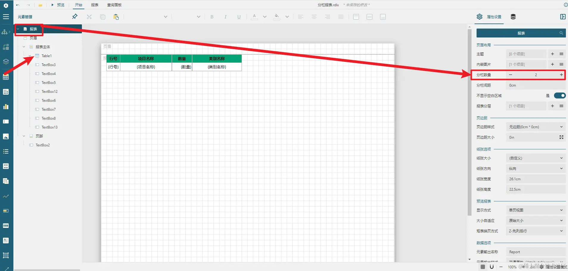 除了上面的2个类型外,也可以做分栏和分组的报表。这里我们以【分栏】类报表为例。