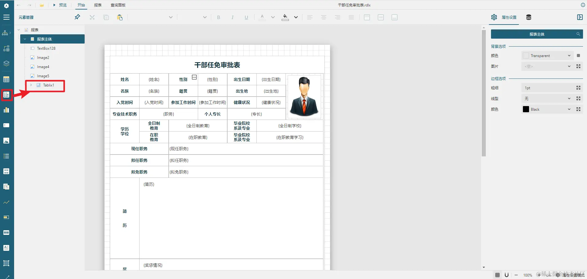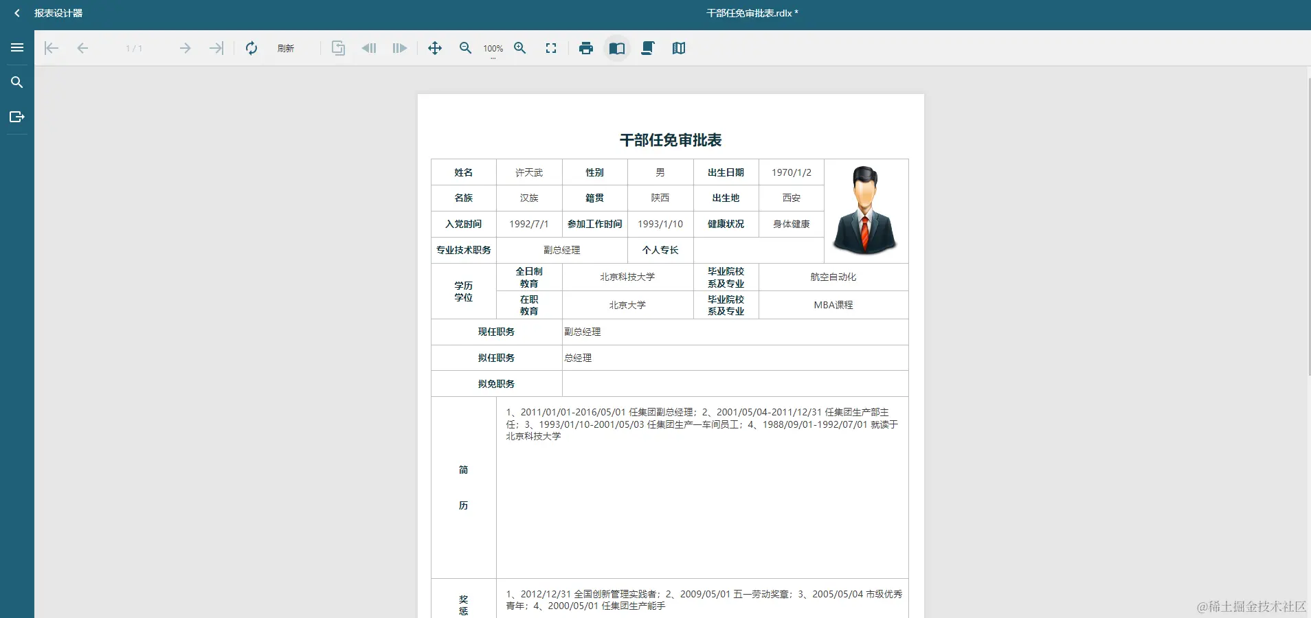 Word文档类报表可以展示Word文档类型的数据效果,比如体检报告单,检验报告单,加工样品单,干部任免审批表等数据展示功能,接下来我们一起看看如何实现,这里我们以【干部任免审批表】为例。