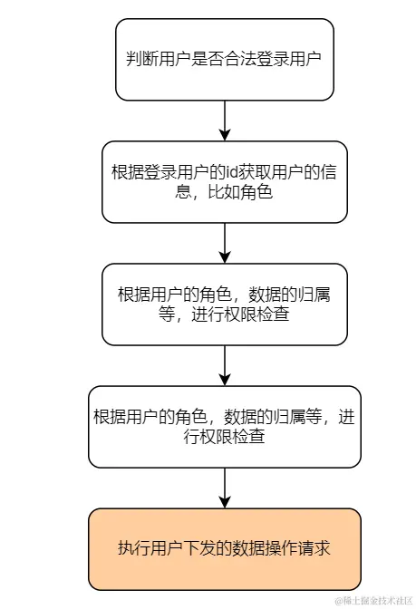 SupaBase的接口使用比较灵活,可以在客户端直接调用,也可以在服务端调用。开发过web应用的同学在处理数据访问权限时应该比较熟悉一些基本的套路,甚至这些套路已经固化到了开发习惯中。我们以一个典型场景来说明一下传统Web开发过程中,数据鉴权的流程: