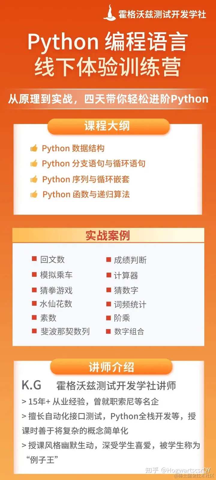 本次训练营我们邀请了资深讲师-K.G,通过理论讲解+实战演练+作业点评三合一的教学方式,帮助大家在工作中更好地进阶Python。我们将采用深入浅出的教学方法,帮助大家更有效地掌握Python编程的核心概念和实用技巧。