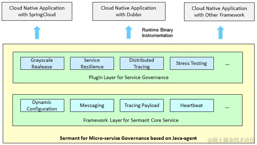 Sermant是基于Java字节码增强技术的无代理的服务网格技术。其利用JavaAgent为宿主应用程序提供增强的服务治理功能,以解决大规模微服务场景中的服务治理问题。Sermant架构如下所示: