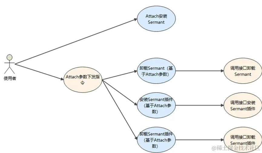 Sermant的动态插件机制主要基于Java Agent的agentmain模式实现,agentmain是Java Agent的入口方法,它可以在Java应用程序启动后动态地加载并运行Java Agent。和premain模式不同,agentmain模式不能通过添加启动参数的方式来连接agent和主程序,需要使用VirtualMachine的attach机制来将agent加载到主程序中, 使用者可以通过Attach参数下发指令来控制Sermant的安装和卸载生命周期。如下所示:
