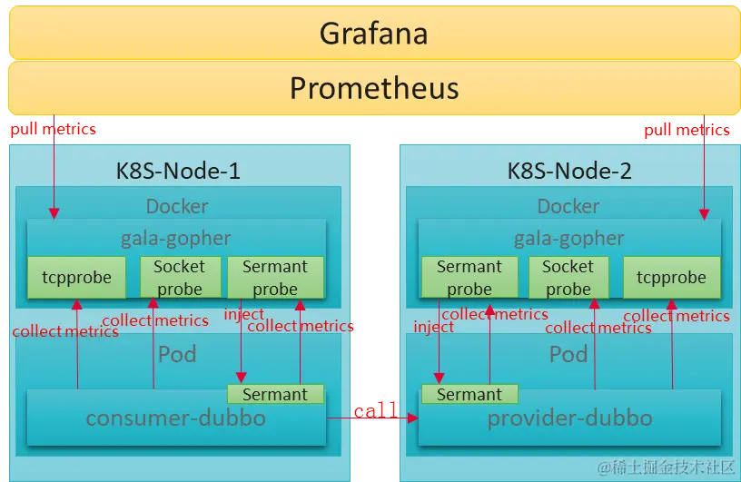 为了验证以上效果,本案例设计了Dubbo应用客户端到服务端的调用链,将其部署在K8S上,并开启一个定期打流的任务,定时给consumer-dubbo服务打流,触发调用链。本案例实验的调用链应用以及gala-gopher、Sermant的部署形态如下图所示: