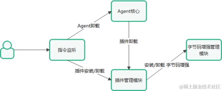 Sermant的动态插件机制是指Sermant可以在宿主服务运行过程中进行插件的安装和卸载。Sermant支持通过指令的方式进行插件的动态安装和卸载,如下图所示:
