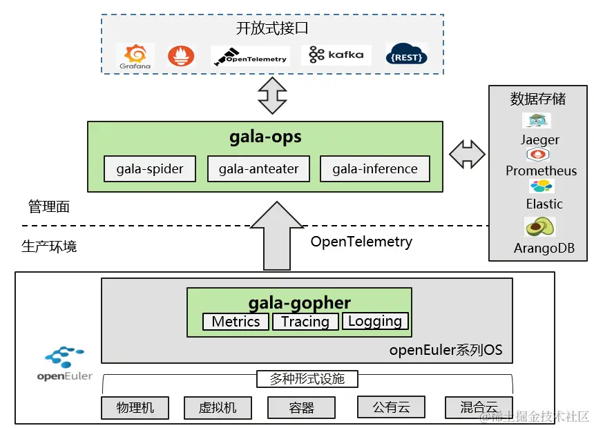 gala-gopher是一款C/S架构、基于AI的操作系统亚健康诊断工具。其基于eBPF + Java Agent无侵入观测技术,并以AI技术辅助,实现亚健康故障(比如性能抖动、错误率提升、系统卡顿等问题现象)分钟级诊断,简化IT基础设施的运维过程。架构图如下图[2]所示: