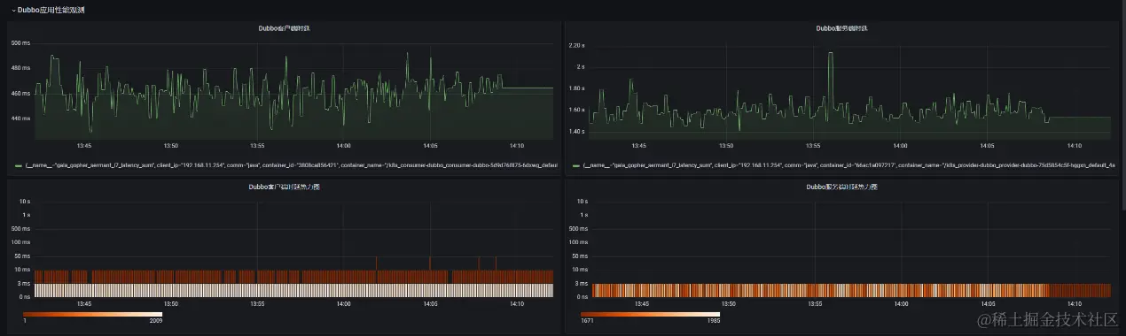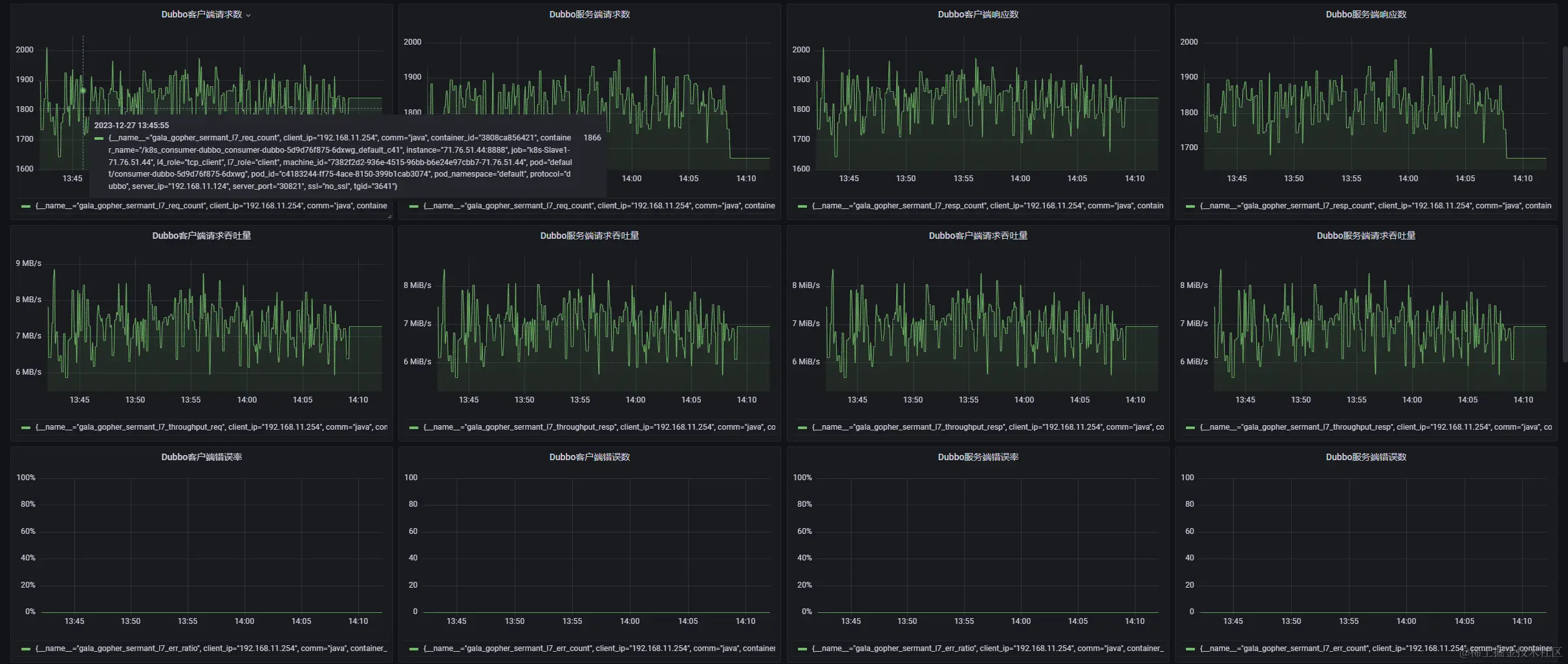 本案例采用prometheus+grafana的方式进行呈现,在prometheus配置了从每个gala-gopher实例处定时拉取指标数据的策略,并在Grafana界面上配置了Dubbo协议指标相关的panel进行呈现。