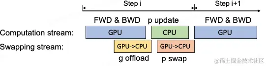 在GPU上面进行前向和后向计算,将梯度传给CPU,进行参数更新,再将更新后的参数传给GPU。为了提高效率,可以将计算和通信并行起来,GPU在反向传播阶段,可以待梯度值填满bucket后,一遍计算新的梯度一遍将bucket传输给CPU,当反向传播结束,CPU基本上已经有最新的梯度值了,同样的,CPU在参数更新时也同步将已经计算好的参数传给GPU,如下图所示。