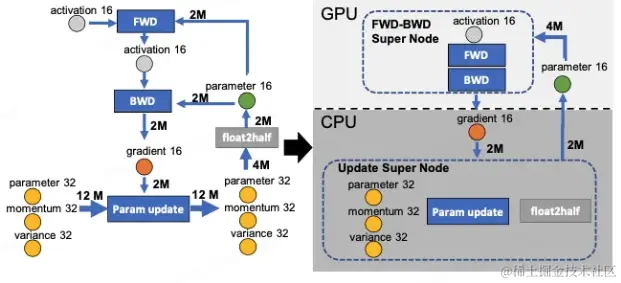 下图中有四个计算类节点:FWD、BWD、Param update和float2half,前两个计算复杂度大致是 O(MB), B是batch size,后两个计算复杂度是 O(M)。为了不降低计算效率,将前两个节点放在GPU,后两个节点不但计算量小还需要和Adam状态打交道,所以放在CPU上,Adam状态自然也放在内存中,为了简化数据图,将前两个节点融合成一个节点FWD-BWD Super Node,将后两个节点融合成一个节点Update Super Node。如下图右边所示,沿着gradient 16和parameter 16两条边切分。
